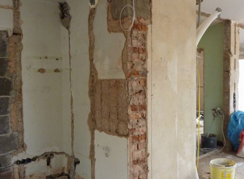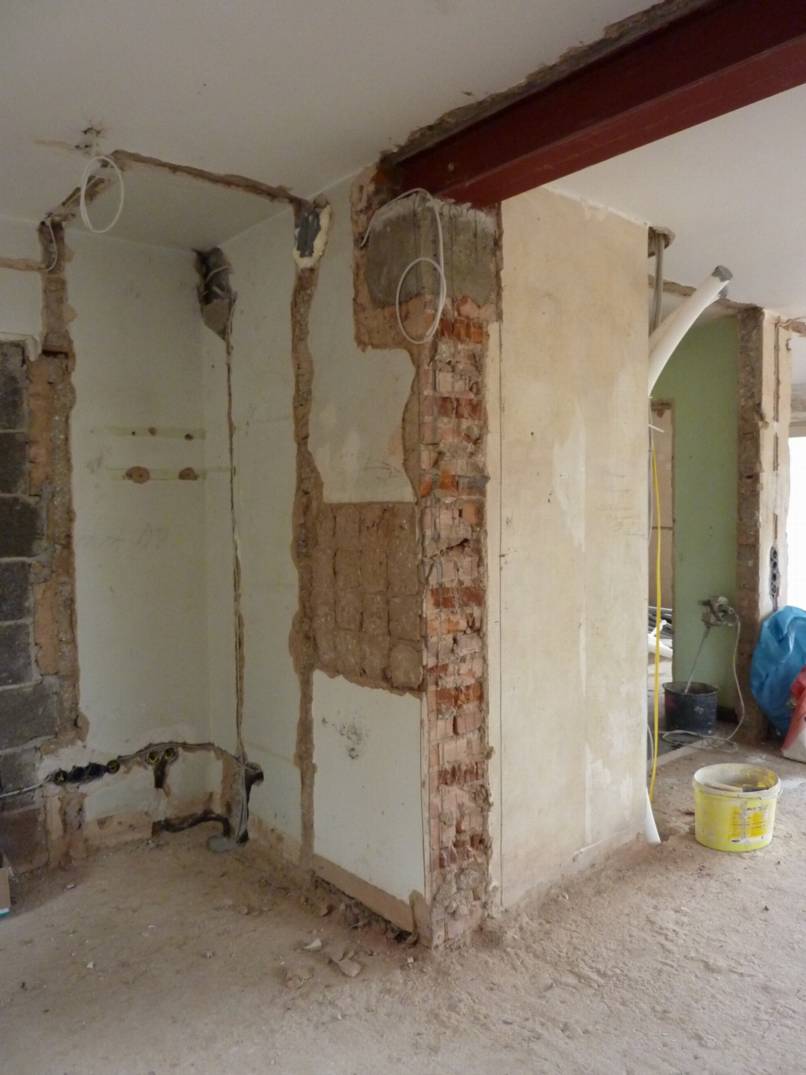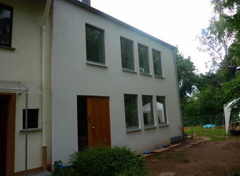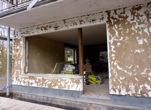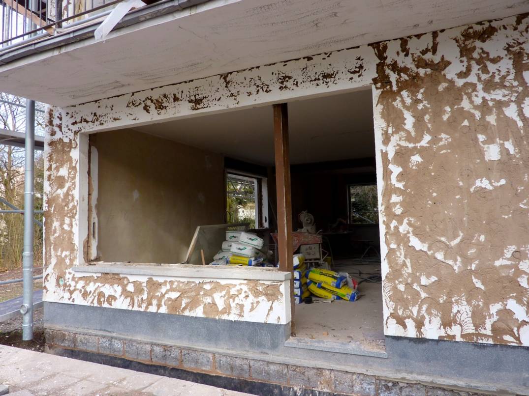 Das 30 cm dicke Mauerwerk wurde außenseitig mit einem 14 cm dicken WDVS aus ESP (WLG 032) gedämmt. Der U-Wert der Außenwand konnte von 1,046 W/(m²*K) auf 0,187 W/(m²*K) verbessert werden.