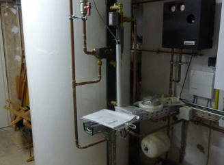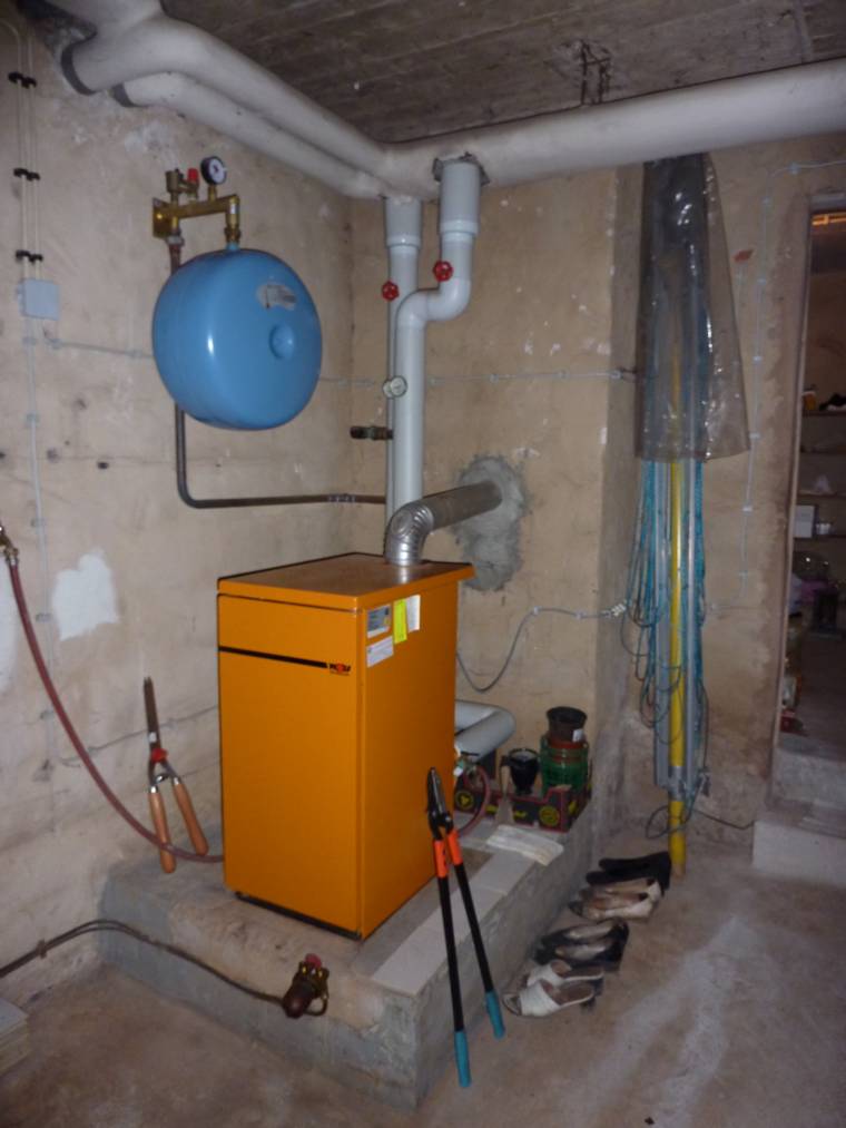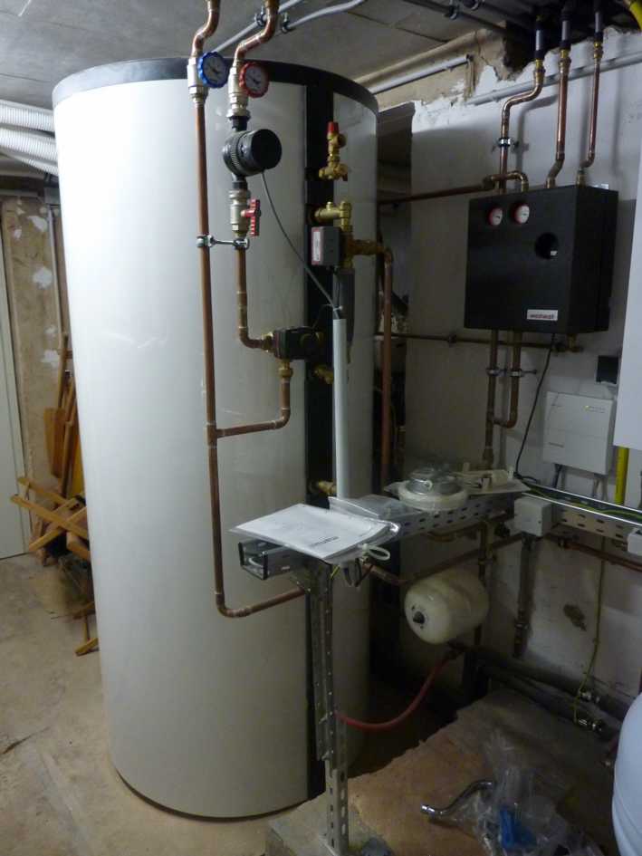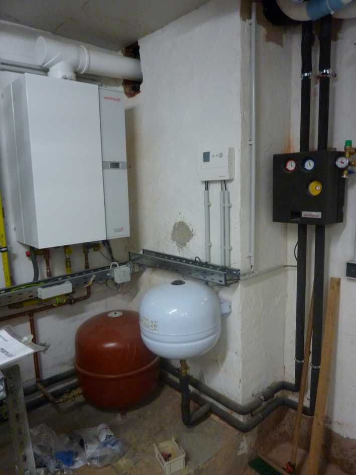 Die neue Anlagentechnik besteht aus einem Gas-Brennwertgerät und einer thermischen Solaranlage zur Warmwasseraufbereitung und Heizungsunterstützung. Die Wärmeübertragung erfolgt über Heizkörper.