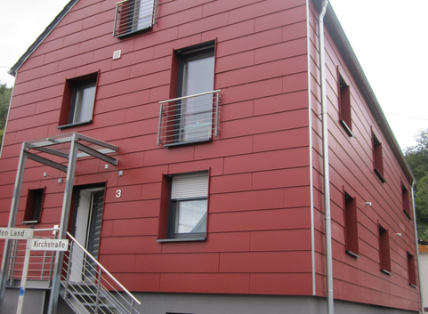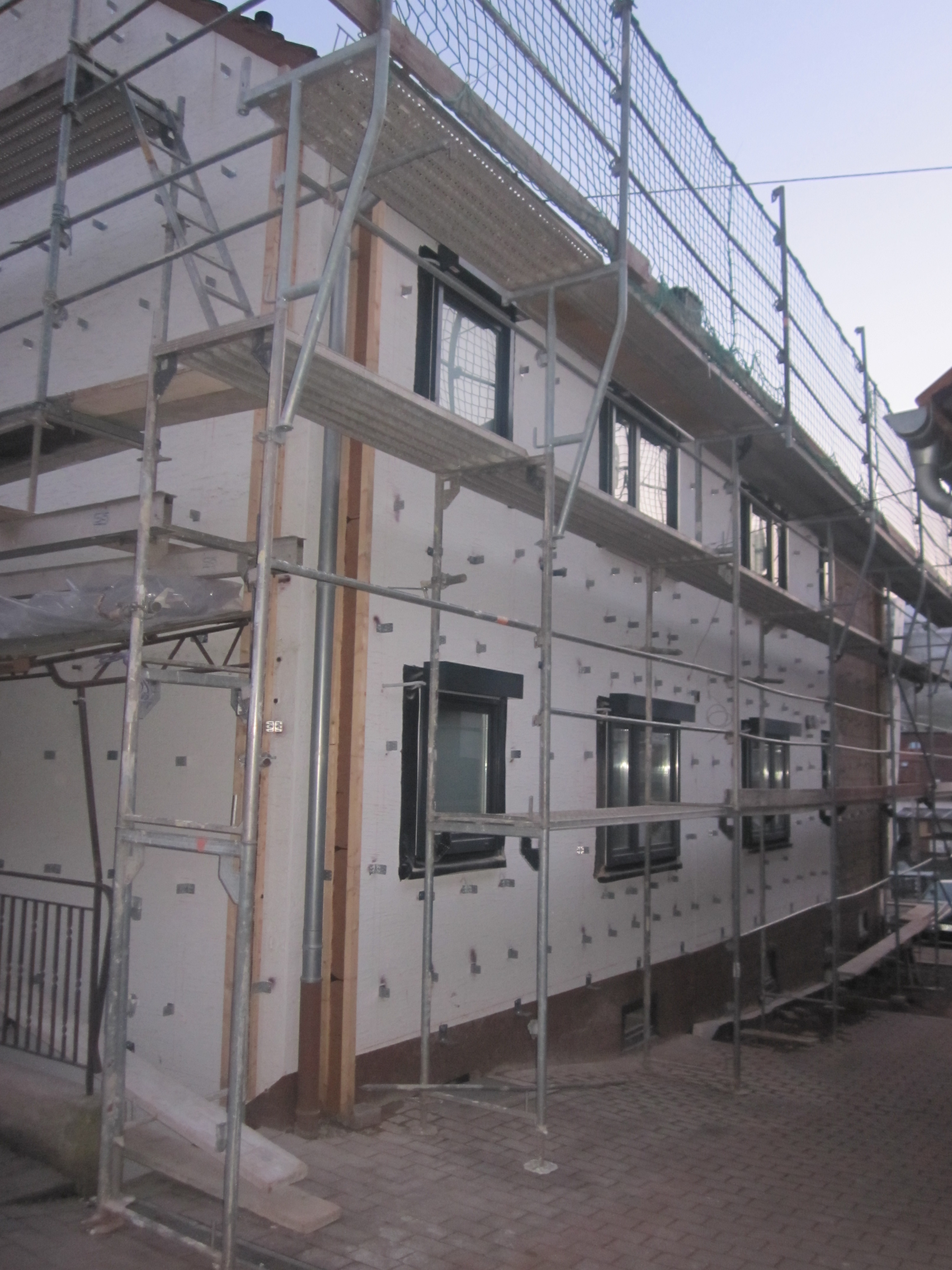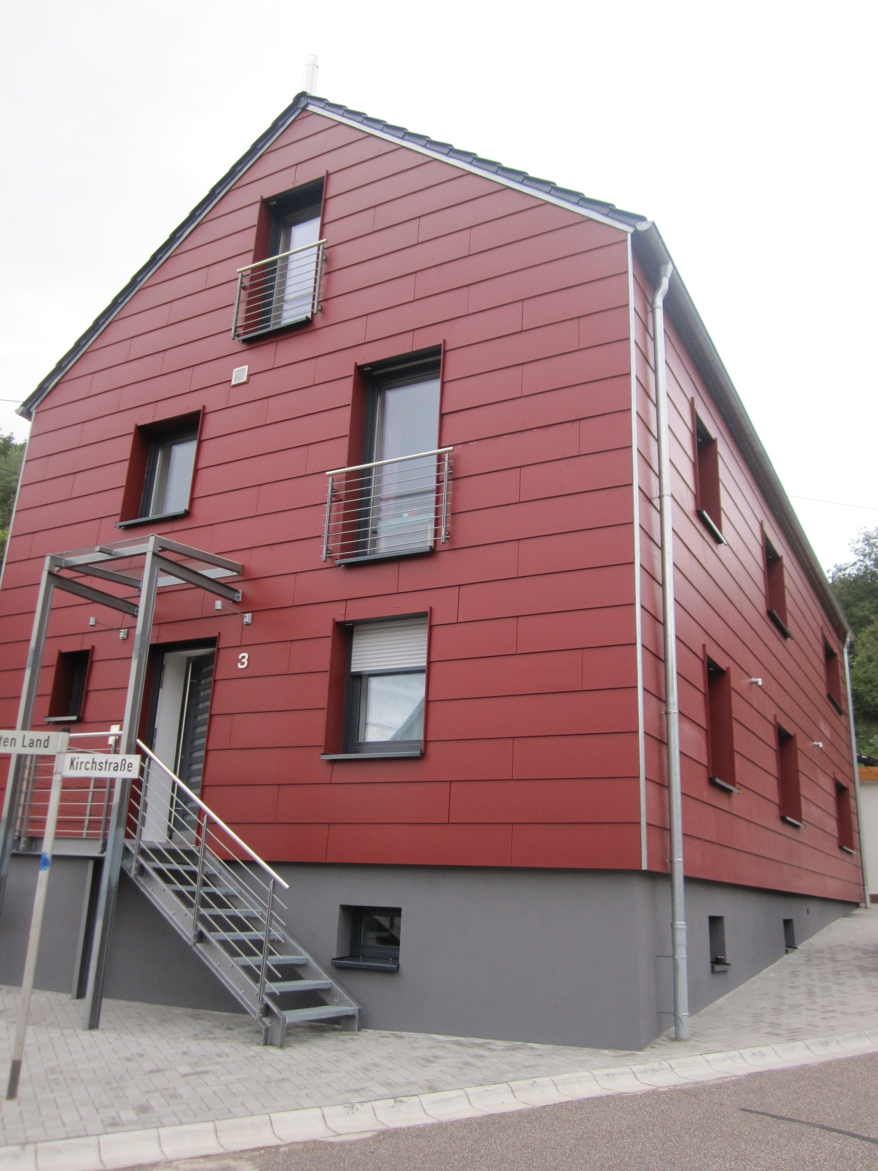 Die Außenwände wurde komplett mit einer vorgehängten, hinterlüfteten Fassade verkleidet. Die Aussendämmung besteht aus einer Holzkonstruktion, die mit Zellulose (WLG 040) 20 cm stark ausgeblasen wurde. Auf die Holzkonstruktion wurden 2 cm dicke Holzfaserdämmplatten (WLG 040) aufgebracht. Abschliessend wurden die Fassadenelemente aus Zementfaserplatten montiert. Der U-Wert der Außenwände konnte von 1,08 W/(m²*K) auf 0,170 W/(m²*K) verbessert werden.