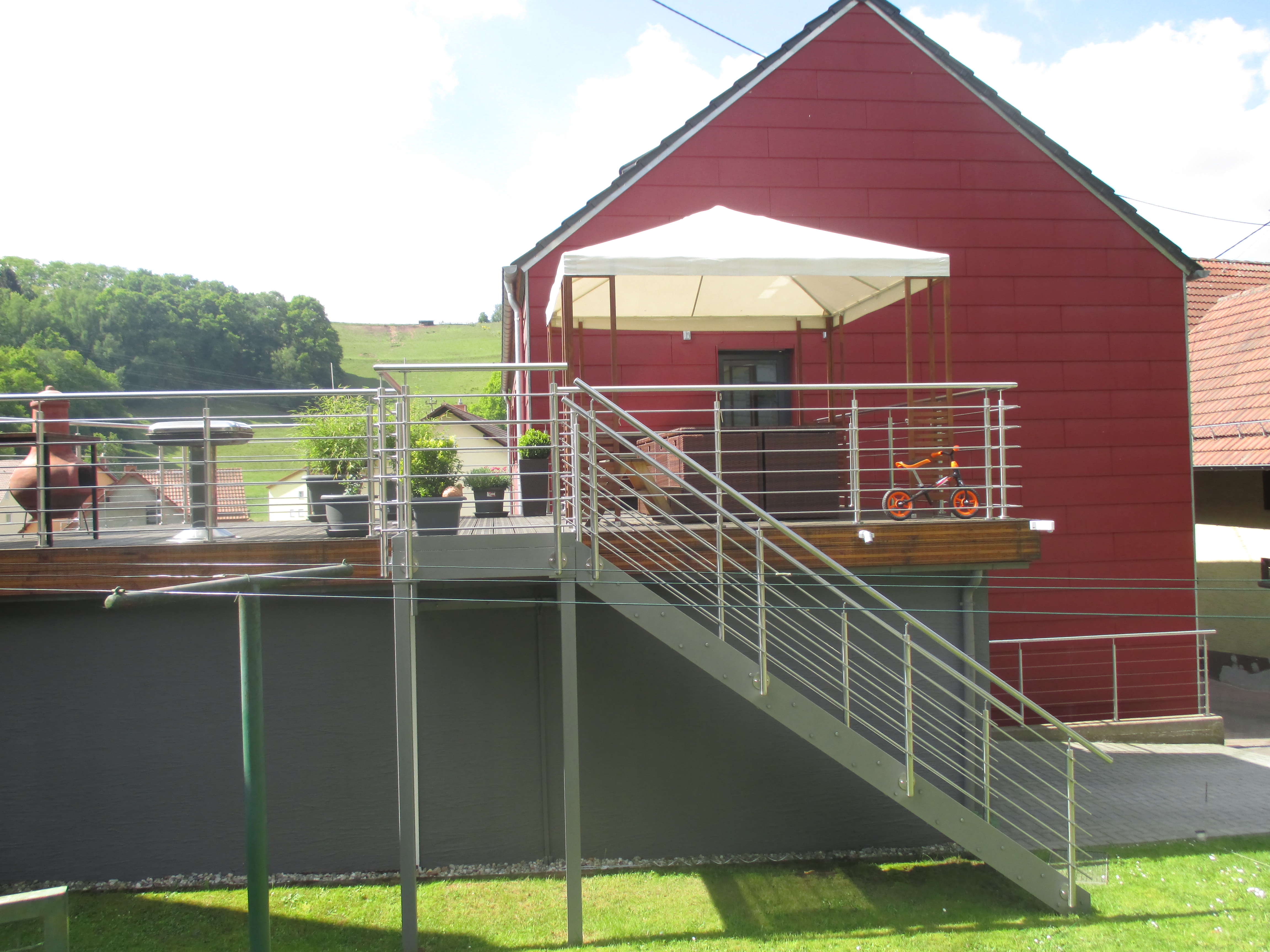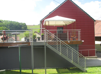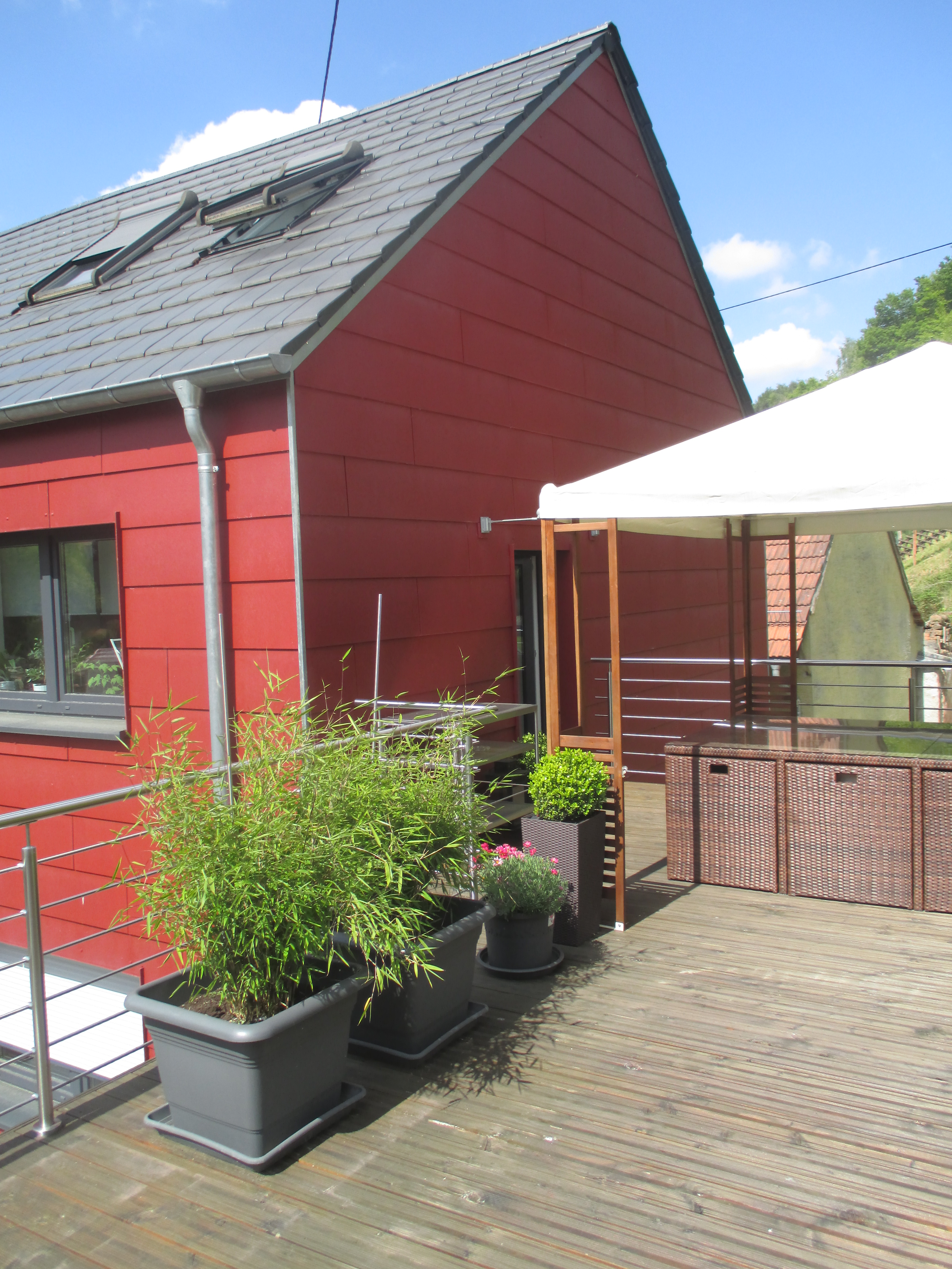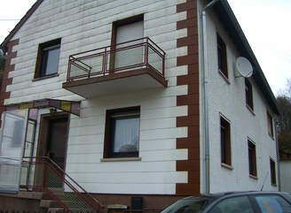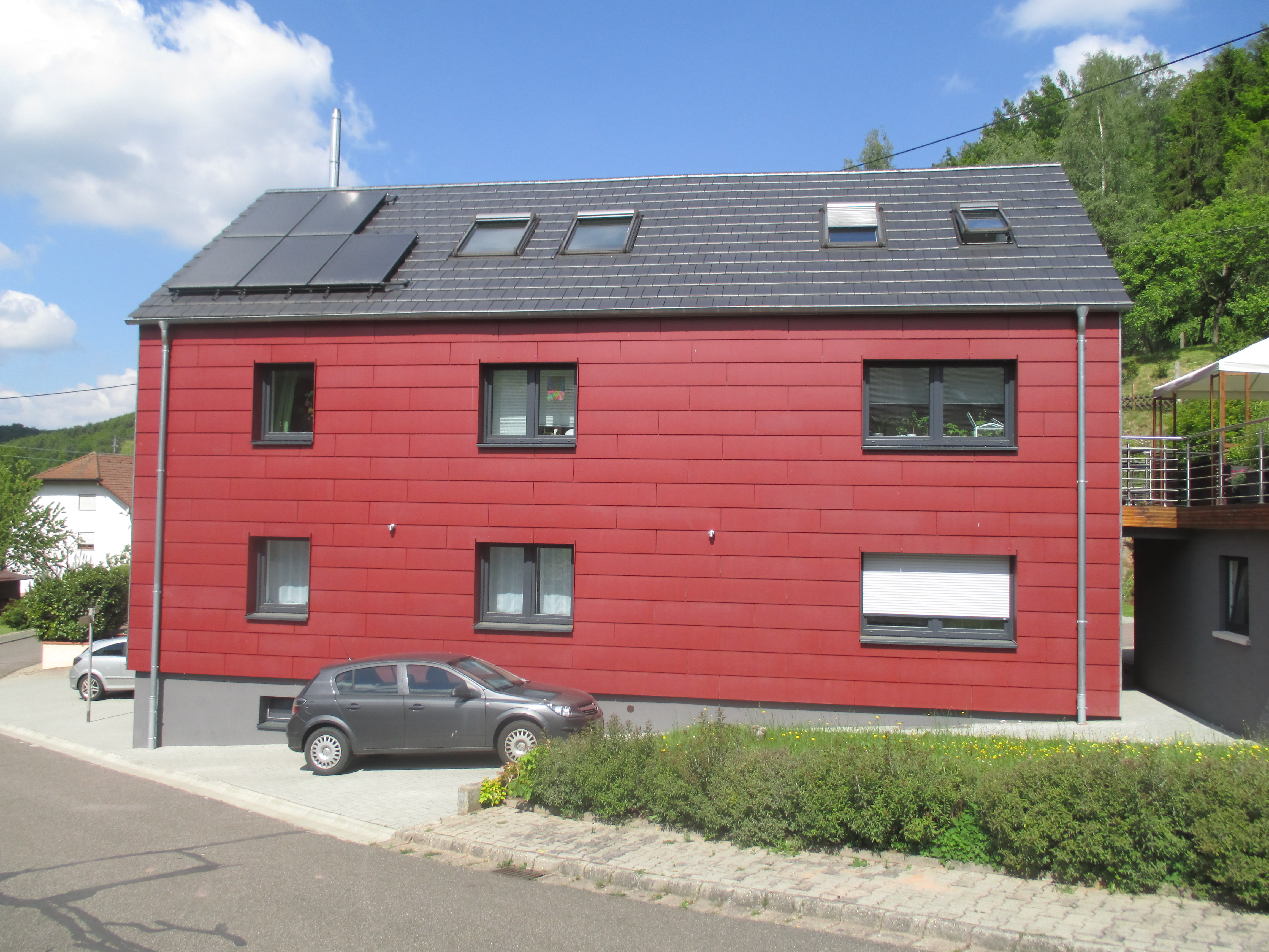 Die Außenwände wurde komplett mit einer vorgehängten, hinterlüfteten Fassade verkleidet. Die Aussendämmung besteht aus einer Holzkonstruktion, die mit Zellulose (WLG 040) 20 cm stark ausgeblasen wurde. Auf die Holzkonstruktion wurden 2 cm dicke Holzfaserdämmplatten (WLG 040) aufgebracht. Abschliessend wurden die Fassadenelemente aus Zementfaserplatten montiert. Der U-Wert der Außenwände konnte von 1,08 W/(m²*K) auf 0,170 W/(m²*K) verbessert werden.
