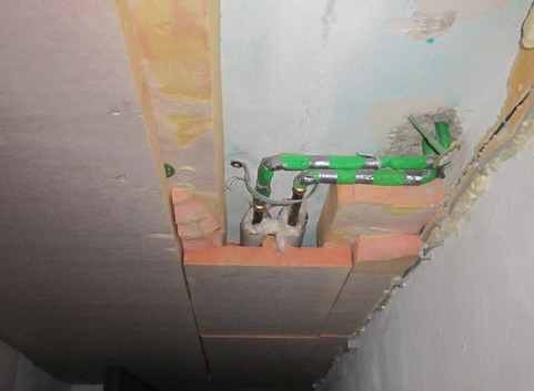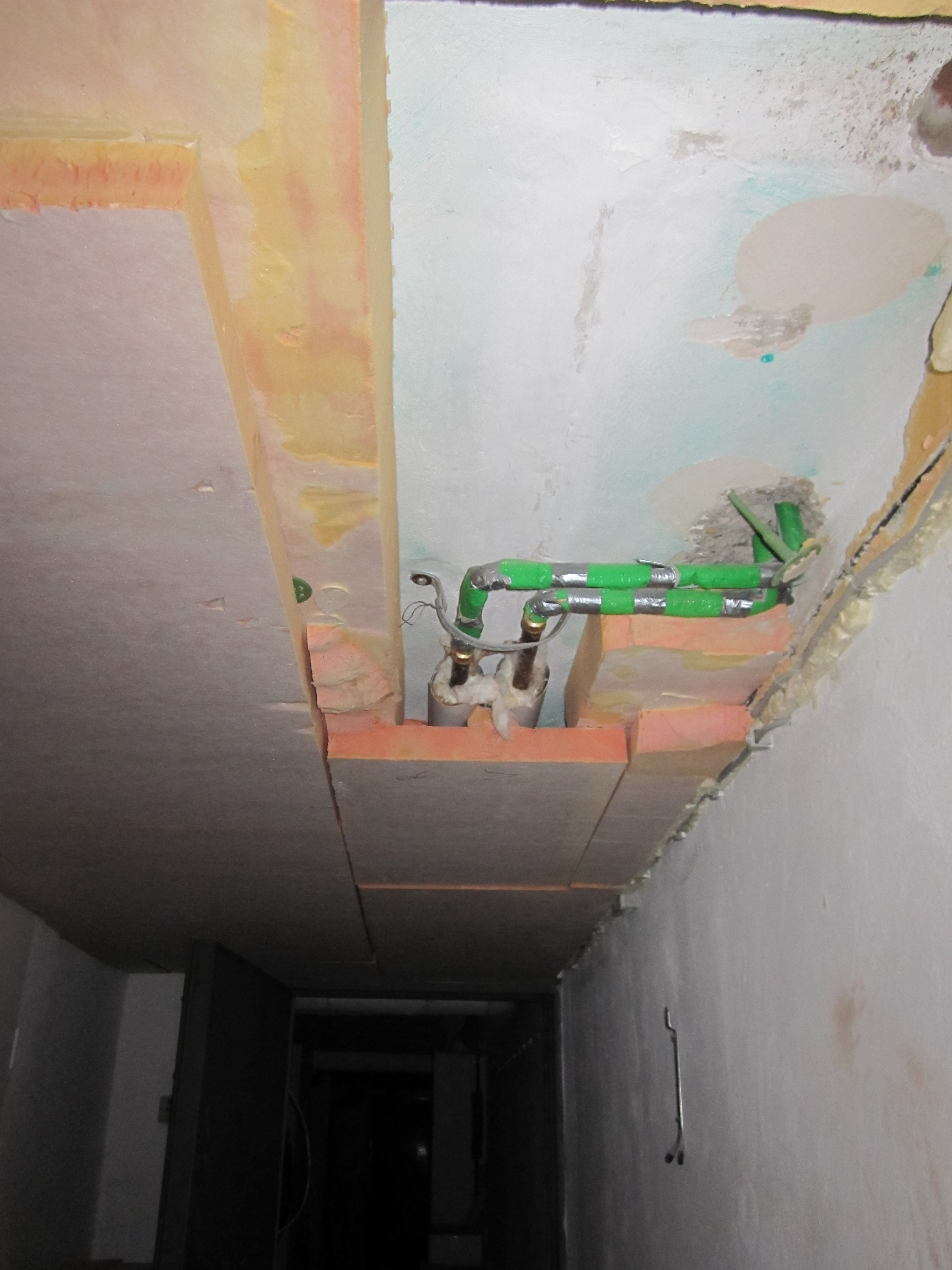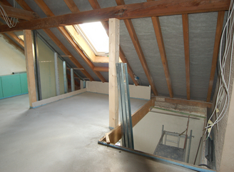 Die Kellerdecke hatte oberseitig eine 2 cm starke Trittschalldämmung aus EPS (WLG 040). Ergänzend wurde die Kellerdecke unterseitig mit einer 10 cm starken Dämmung aus Phenolhartschaum (WLG 022) angebracht. Der U-Wert der Kellerdecke konnte von 0,922 W/(m²*K) auf 0,180 W/(m²*K) verbessert werden.