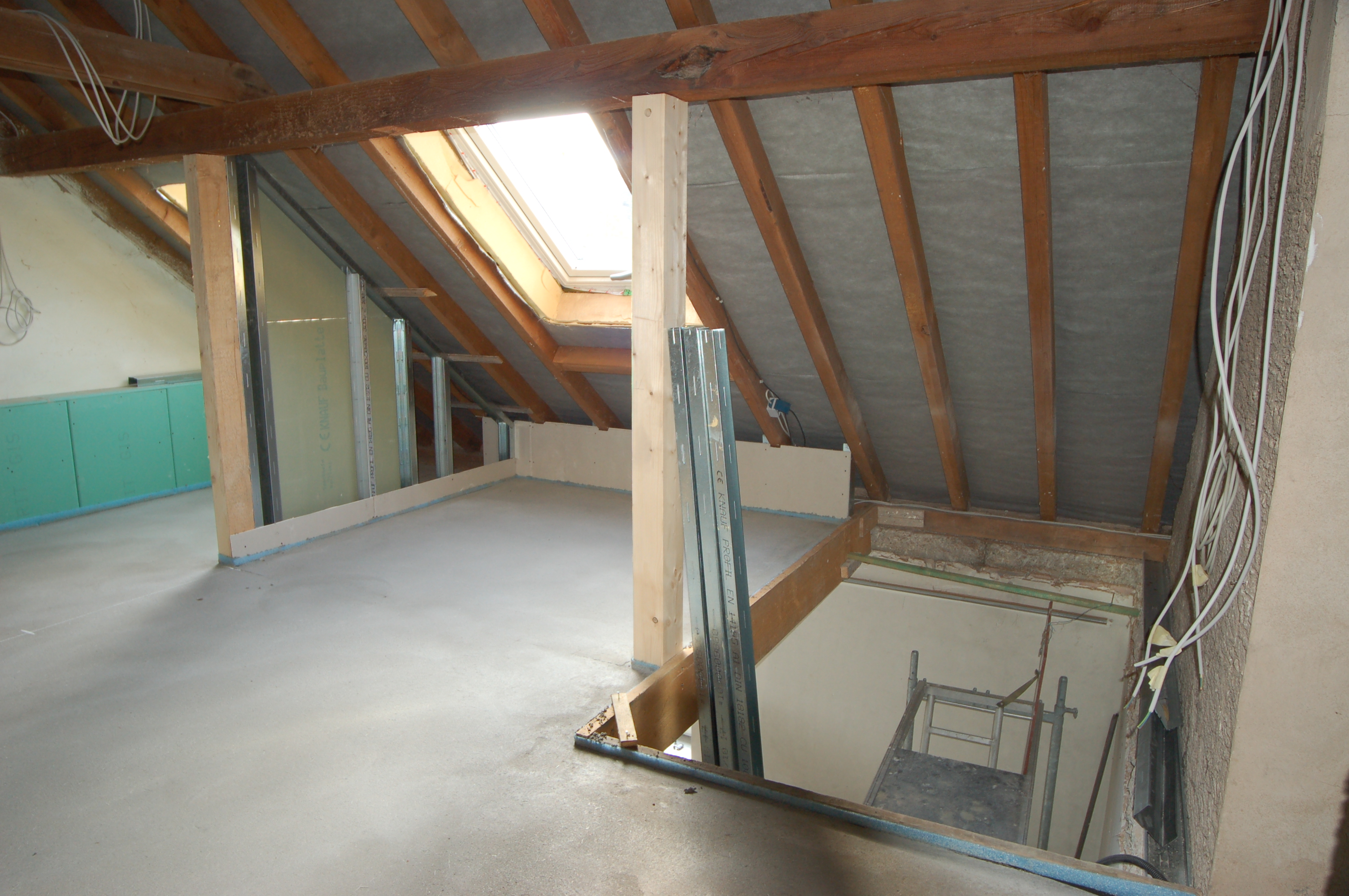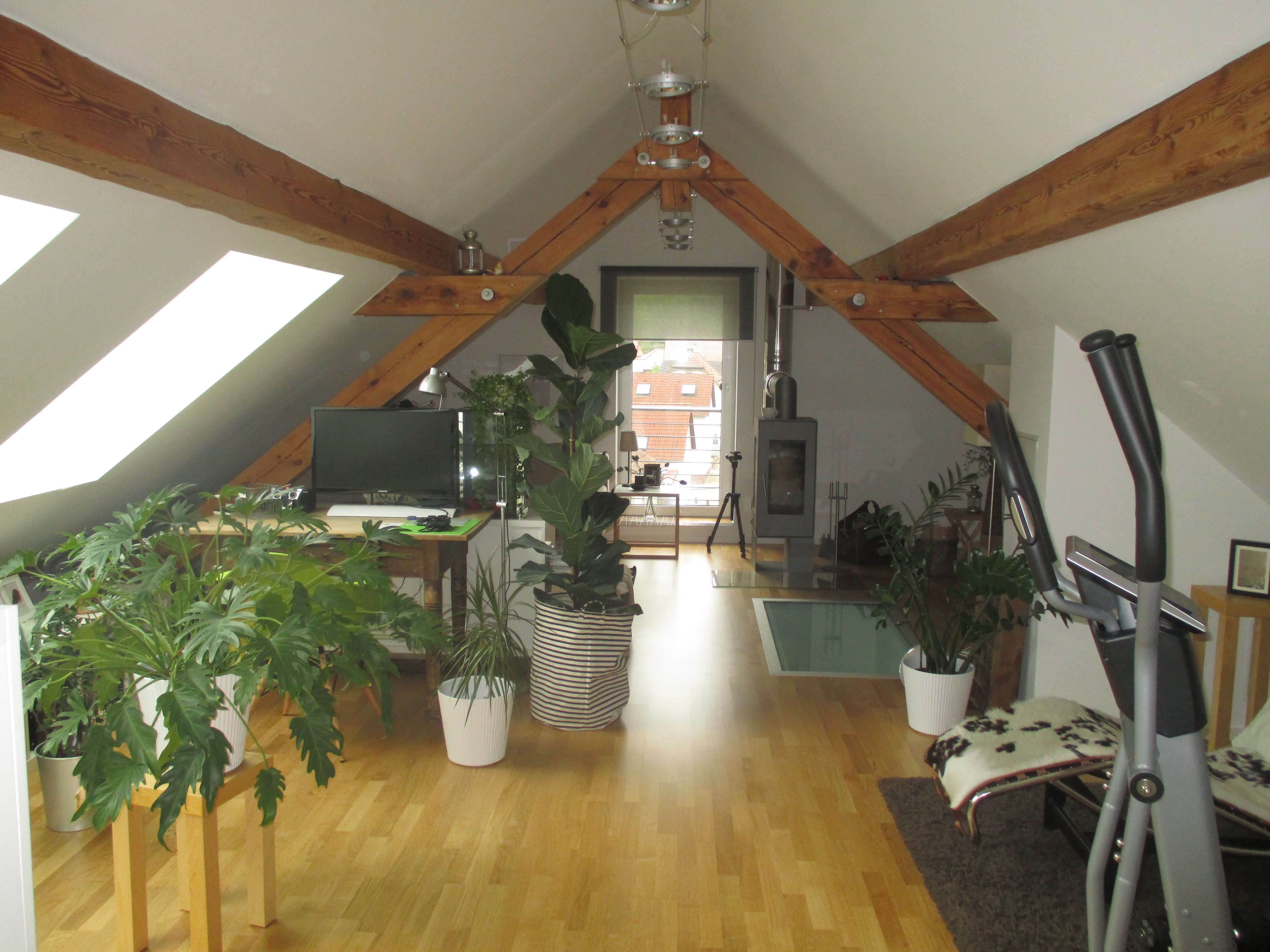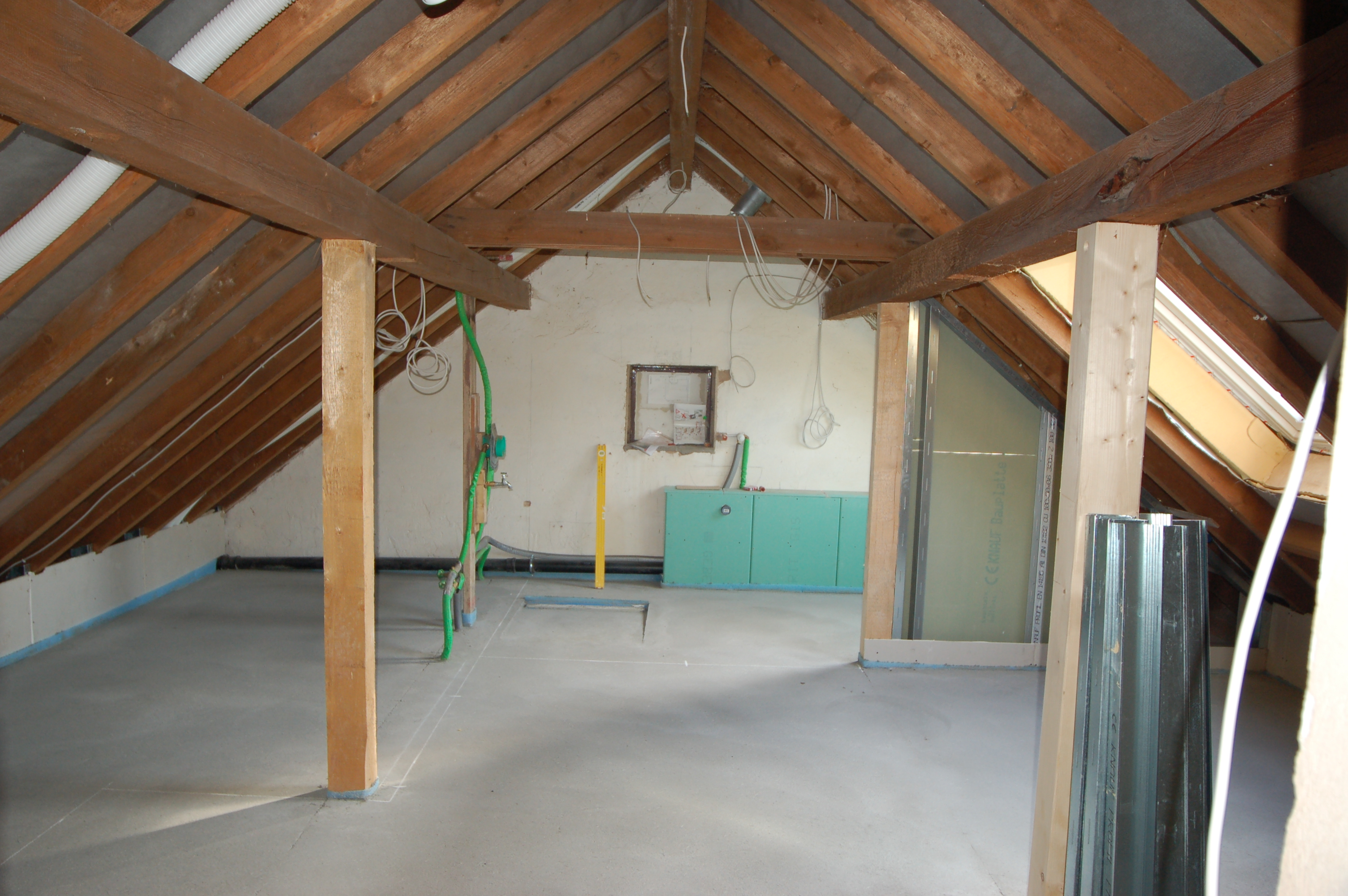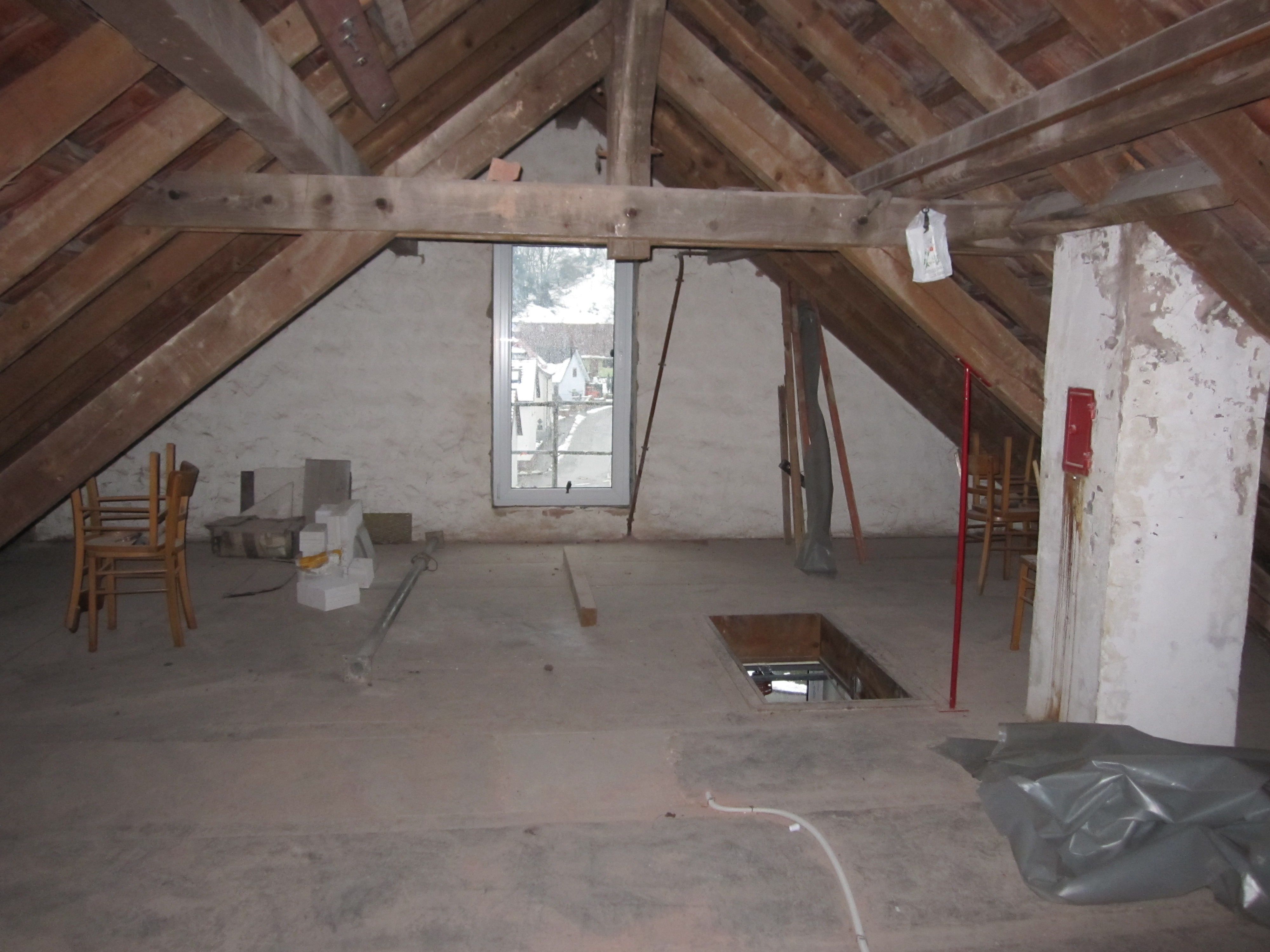 Das Dach wurde mit einer 20 cm Aufsparrendämmung aus Polyurethan (WLG 024) gedämmt. Vor der Sanierung stellte die oberste Geschossdecke, mit einem U-Wert von 0,82 bzw. 2,31 W/(m²*K), ein Teil der Gebäudehüllfläche dar. Nach der Sanierung ist der U-Wert der Dachfläche maßgebend. Der U-Wert beträgt 0,12 W/(m²*K).