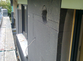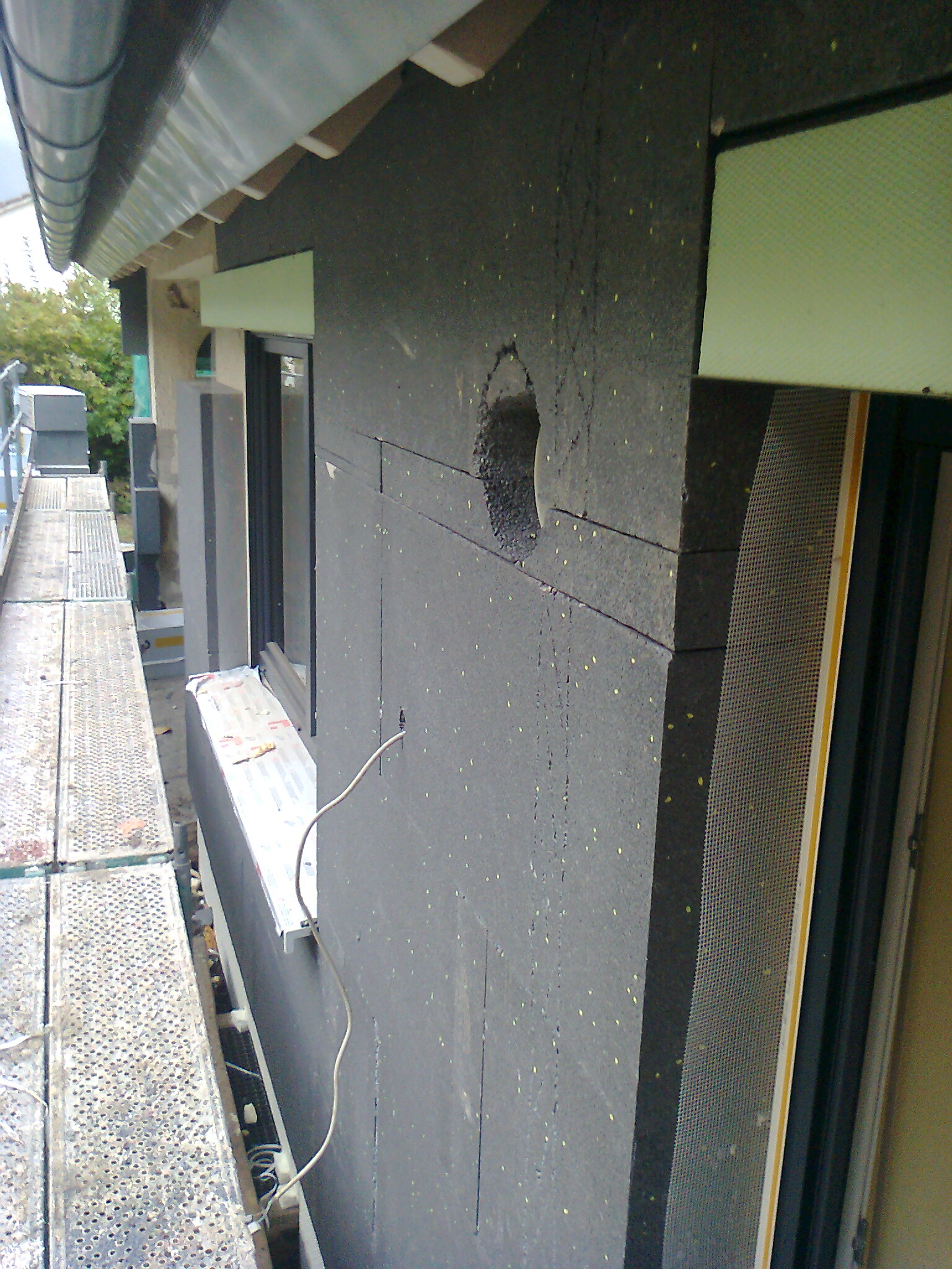 Die Außenwände aus 30 cm Hohlblocksteinen wurden mit einem 18 cm dicken WDVS aus Polystyrol EPS (WLG 032) gedämmt. Der U-Wert der Außenwände konnte von 1,16 W/(m²*K) auf 0,15 W/(m²*K) verbessert werden.