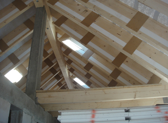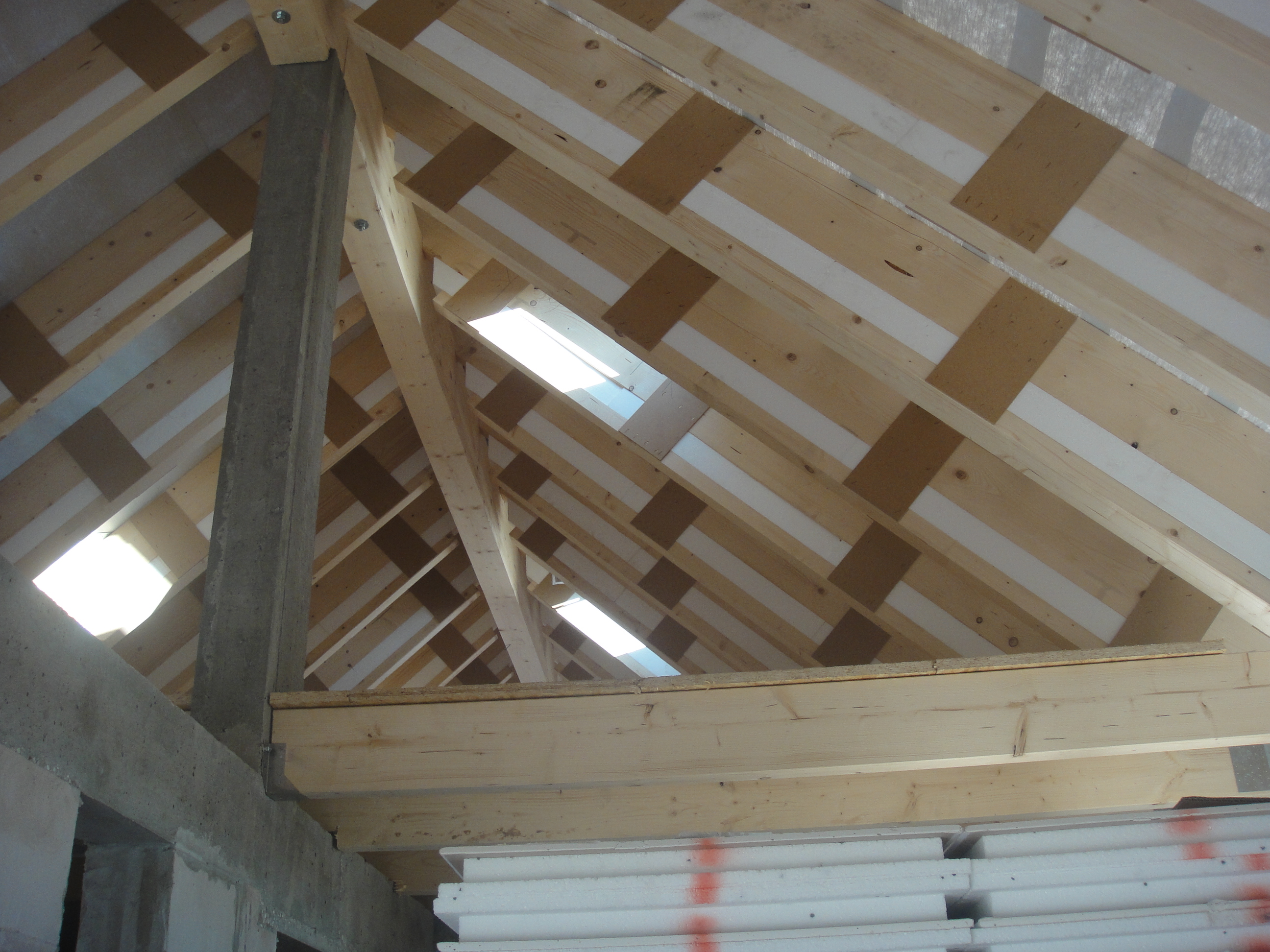 Die Konstruktion des Satteldaches wurde mit thermisch getrennten Sparren ausgeführt. Die Trennung erfolgt durch 6 cm Mineralwolle (WLG 035). Die Zwischensparrendämmung wurde ebenfalls mit Mineralwolle (WLG 035) in einer Stärke von 34 cm ausgeführt. Als Untersparrendämmung wurden 10 cm Polystyrol (WLG 040) eingebaut. Der U-Wert des Daches beträgt 0.09 W/(m²*K).