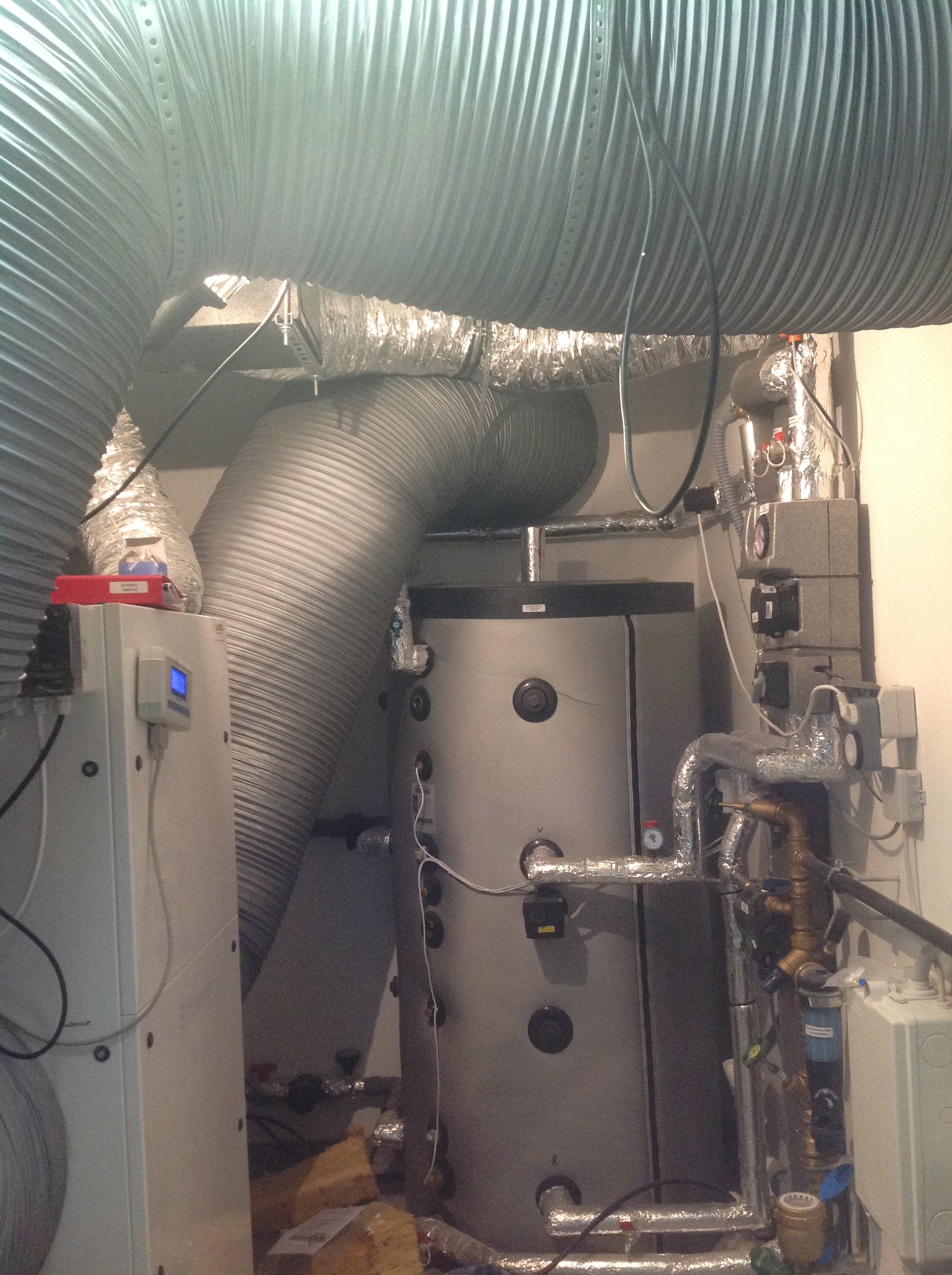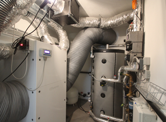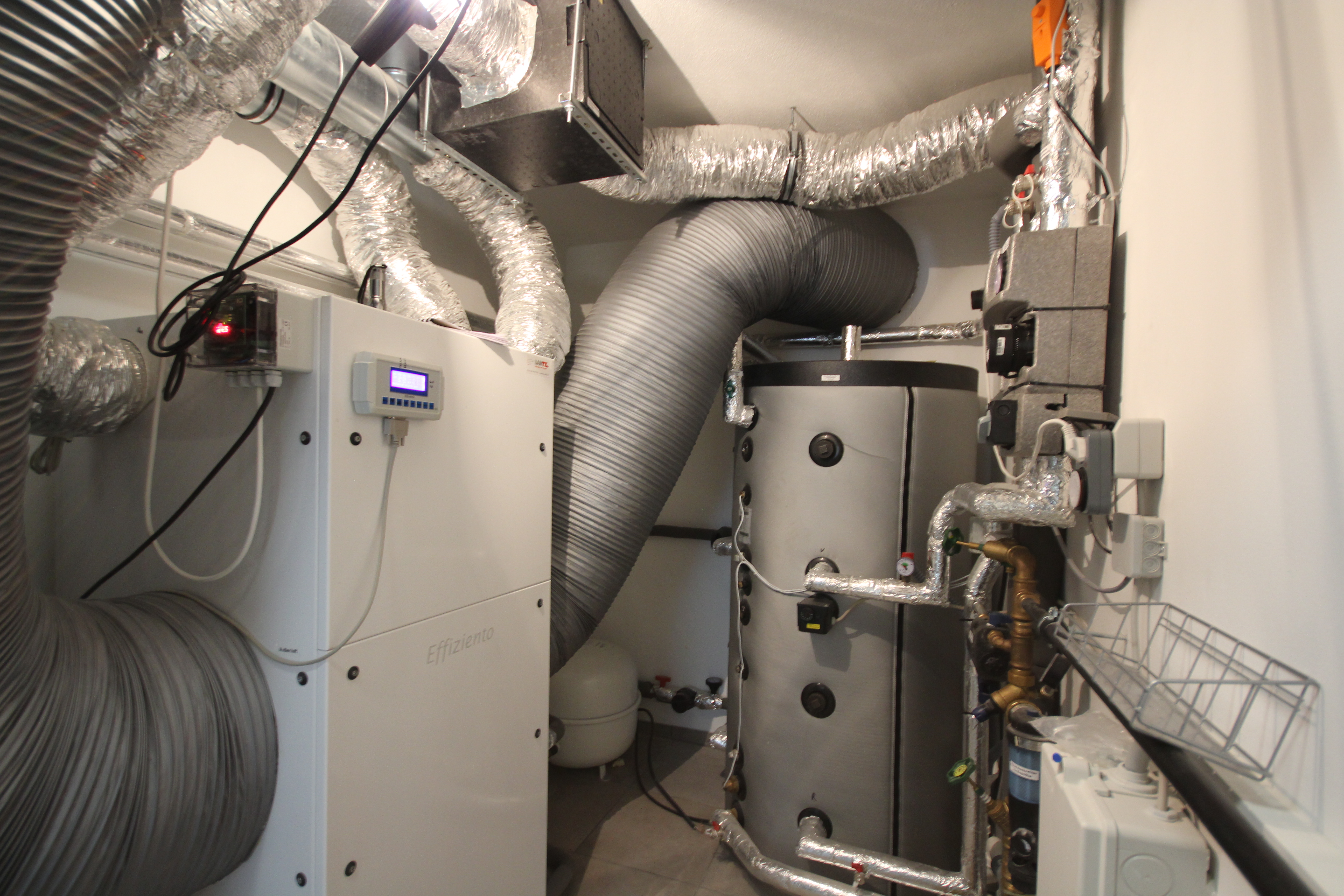 Zur zentralen Be- und Entlüftung sowie zur zentralen Warmwasserbereitung und Wärmeversorgung wurde ein Kompaktgerät (Luft-/Wasser-Wärmepumpe mit Wärmerückgewinnung) eingebaut. Die Wärmerückgewinnung beträgt effektiv > 75 %. Die Wärmeübertragung erfolgt über Fußbodenheizung. Ein Holzofen dient der Heizungsunterstützung.