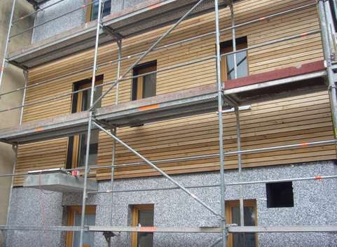 Die Außenwände des Gebäudes wurden aus 24 cm starken Ytong-Fertigteilen hergestellt und mit einem zusätzlichen WDVS (WLG 035) von 16 cm Stärke gedämmt. Das WDVS wurde bei der verputzten Fassade mit Polystyrol ausgeführt und im Bereich der hinterlüfteten Holzverschalung mit Mineralwolle. Der U-Wert der Außenwand beträgt 0.13 bzw. 0.14 W/(m²*K).