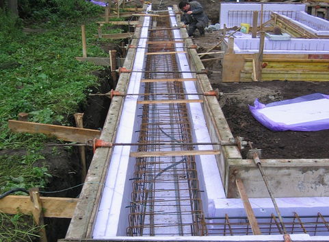 Die Bodenplatte wurde unterseitig und die Fundamente umlaufend mit 16 cm Polystyrol XPS (WLG 035) gedämmt. Oberseitig wurde eine 6 cm dicke Trittschalldämmung (WLG 035) aus Polystyrol XPS aufgebracht. Der U-Wert der Bodenplatte beträgt 0.15 W/(m²*K).