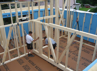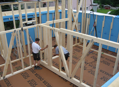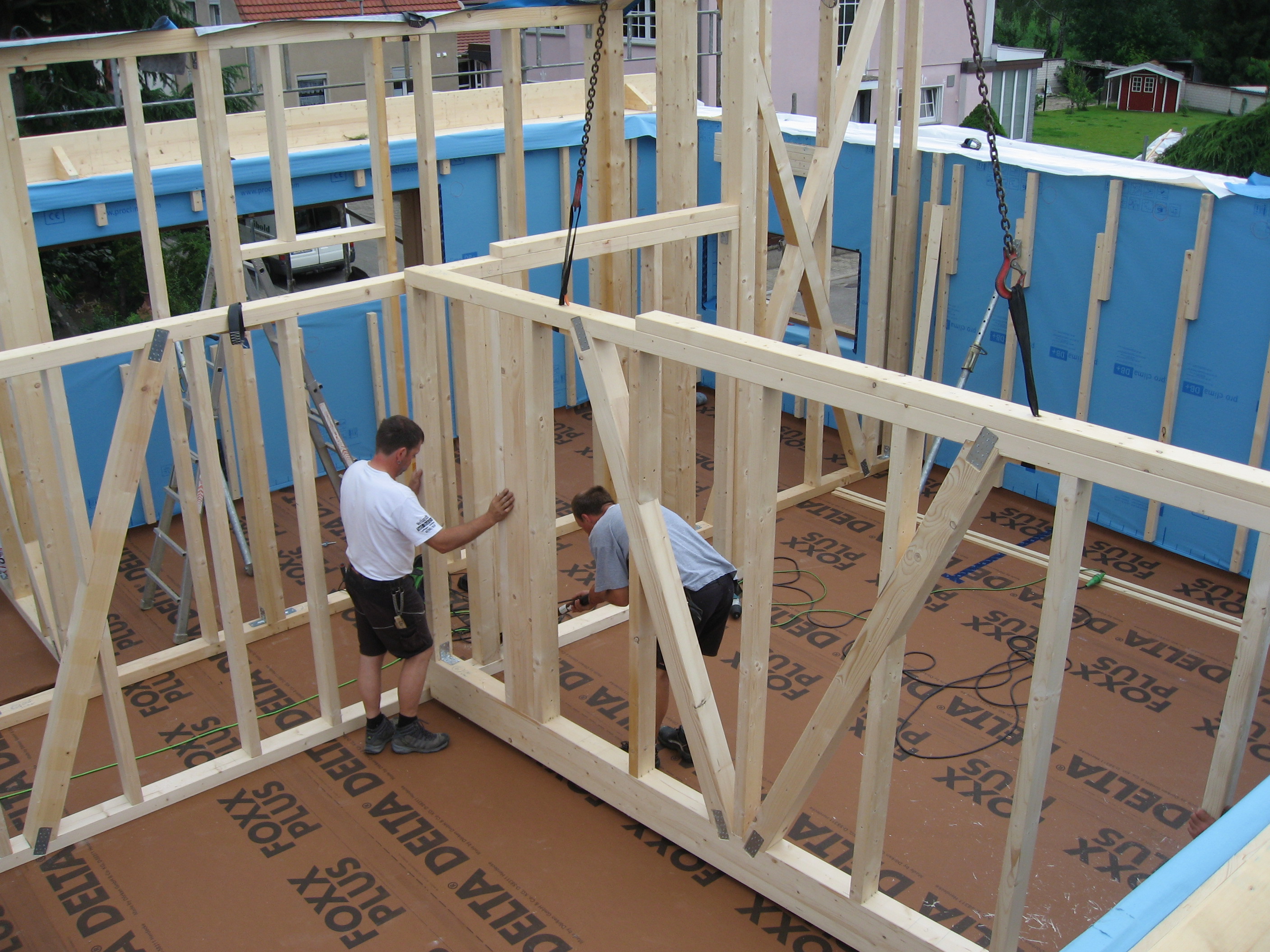 Die Außenwände des Gebäudes bestehen aus einem 36 cm starken Holzständerwerk, dass mit Holzfaserdämmplatten (WLG 040) ausgefacht ist. Die Konstruktion ist von innen mit 4 cm starken Holzfaserdämmplatten (WLG 040) gedämmt. Außenseitig mit mit 6 cm starken Holzfaserdämmplatten (WLG 047) beplankt. Der U-Wert der Außenwand beträgt 0,107 W/(m²*K).