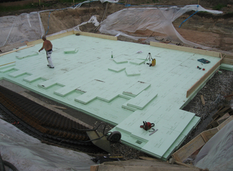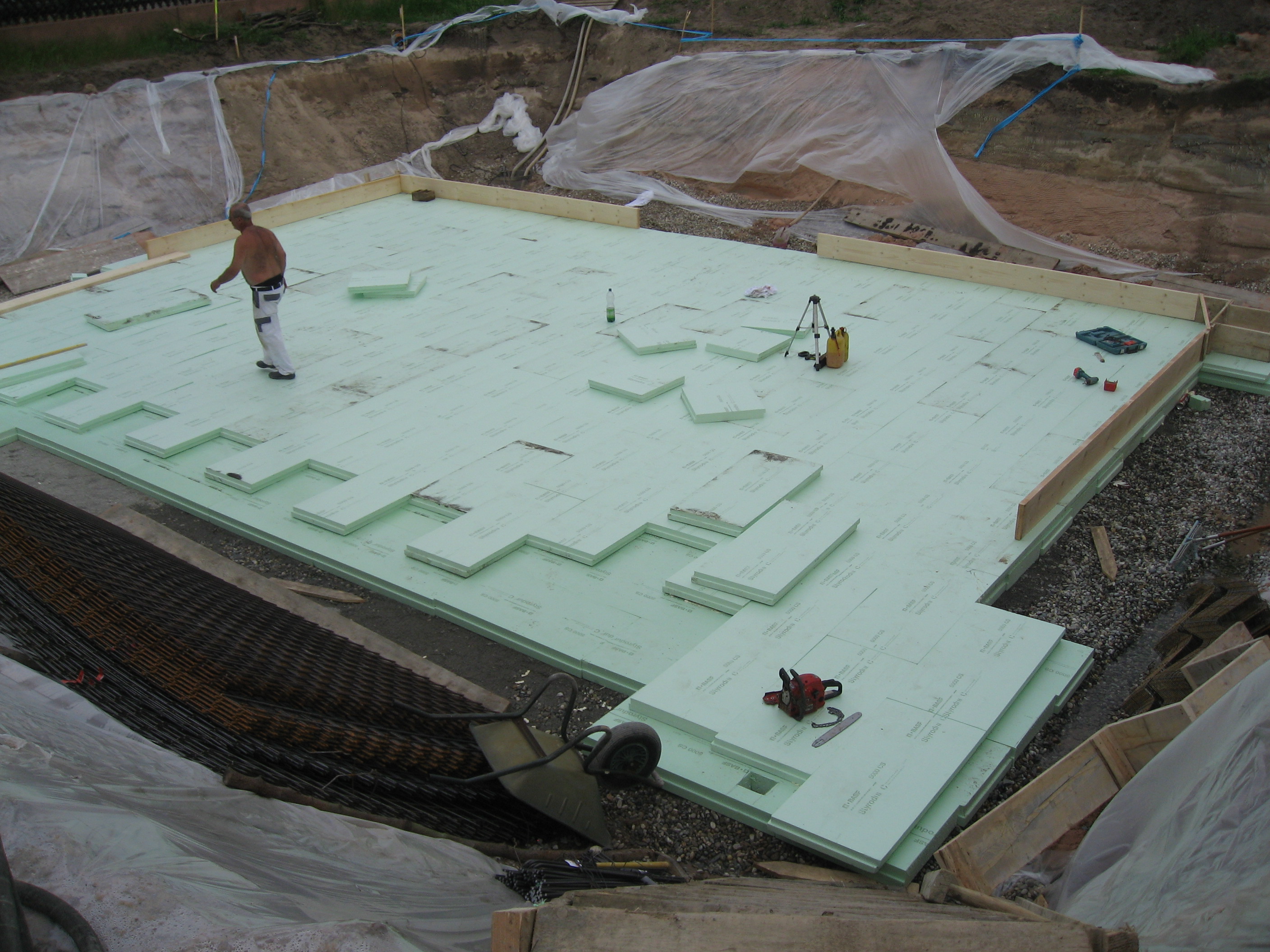 Die 25 cm starke Stahlbetonbodenplatte wurde auf eine Dämmschicht aus 20 cm Polystyrol (WLG 038) gegründet. Oberseitig wurde eine 8 cm dicke Dämmschicht aus PUR/PIR-Hartschaum (WLG 024) aufgebracht. Der U-Wert der Bodenplatte beträgt 0,11 W/(m²*K).