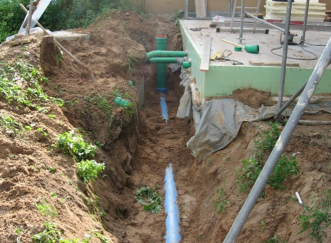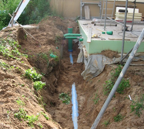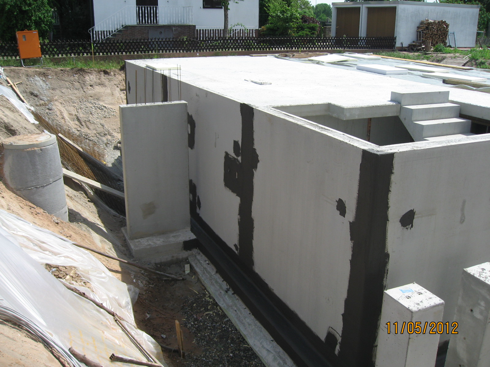 Die Kellerwände aus 20 cm Stahlbeton sind außenseitig mit 24 cm Polystyrol PS-Partikelschaum (WLG 038) verkleidet. Der U-Wert der Kellerwände beträgt zwischen 0,15 W/(m²*K).