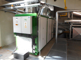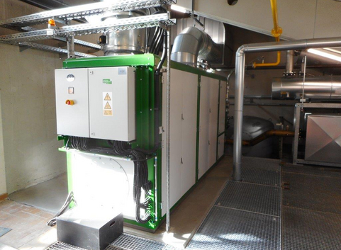 - Erneuerung zweier Heizkessel zur Spitzenlastabdeckung mit je 900 kW Leistung und modulierenden Brennern, wahlweise im Gas- oder Ölbetrieb.