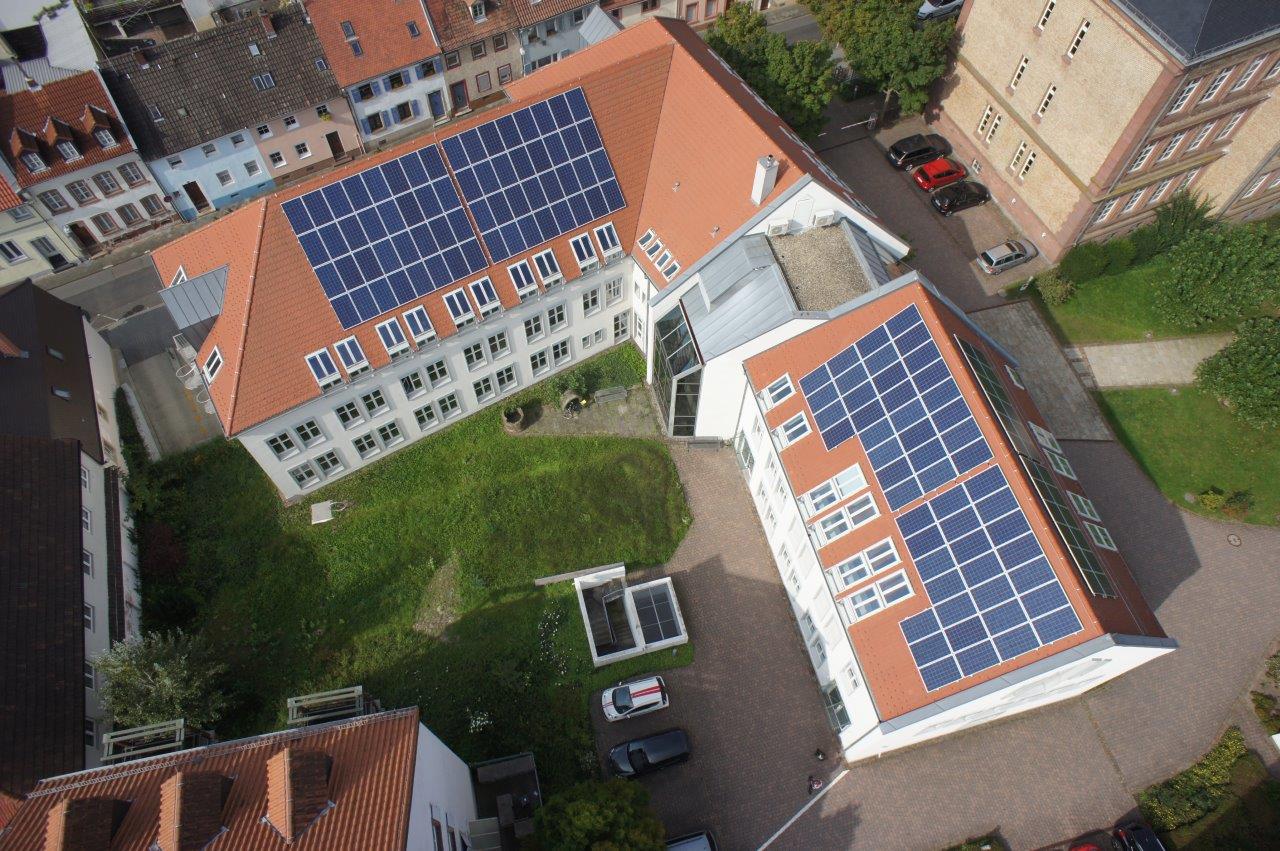 Der Stromverbrauch der Verwaltungsgebäude ist wegen Servern und der Klimatisierung von Archiven vergleichsweise hoch. Mit der Kombination von Photovoltaik-Anlage und Blockheizkraftwerk wird sowohl im Sommer als auch im Winter Strom erzeugt, der größtenteils selbst verbraucht wird. Die 44 kWp-PV-Anlage wurde auf den Eigenverbrauch ausgerichtet: 85% des erzeugten Stroms wird selbst verbraucht. Für die PV-Anlage wurde eine Lösung gefunden, die der Gestaltungssatzung für den Altstadtbereich der Stadt Speyer Rechnung trägt.