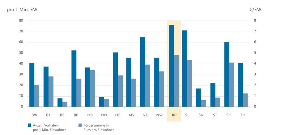 Im langjährigen Vergleich liegt Rheinland-Pfalz bei der Inanspruchnahme strategischer Klimaschutzmaßnahmen sowohl bei der Zahl der geförderten Vorhaben als auch bei der Fördersumme pro Einwohner vorne. Der Statusbericht 2022 der Klima- und Energieagentur Baden-Württemberg zeigt, dass in Rheinland-Pfalz von 2008 bis 2020 mehr als 75 strategische Vorhaben pro einer Million Einwohner umgesetzt wurden. Das entspricht einer Fördersumme von 4,80 € je Einwohner.