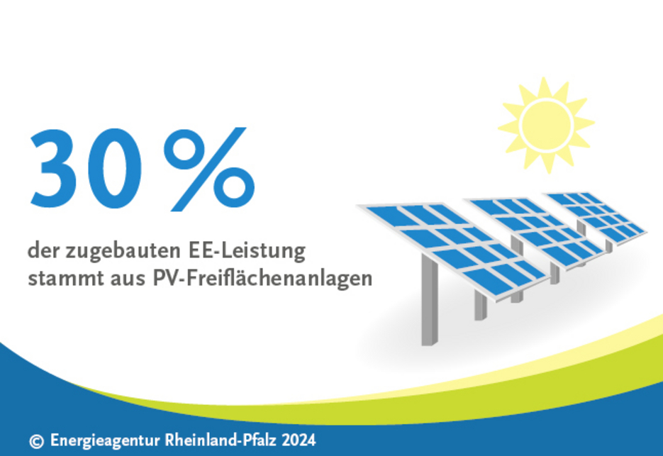 Im ersten Halbjahr 2024 stammten in Rheinland-Pfalz 30 Prozent der zugebauten Stromerzeugungsleistung aus Erneuerbaren Energien von PV-Freiflächenanlagen. Insgesamt 42 neue Anlagen (> 2kW) gingen ans Netz – mit einer Bruttoleistung von rund 145 MW. Der Gesamtzubau durch PV-Anlagen betrug in den ersten 6 Monaten des Jahres rund 430 MW (2023: 387 MW). Damit ist das Zubauziel von 500 MW pro Jahr im Solarbereich schon zur Jahresmitte fast erreicht und eine Übererfüllung 2024 sehr wahrscheinlich.